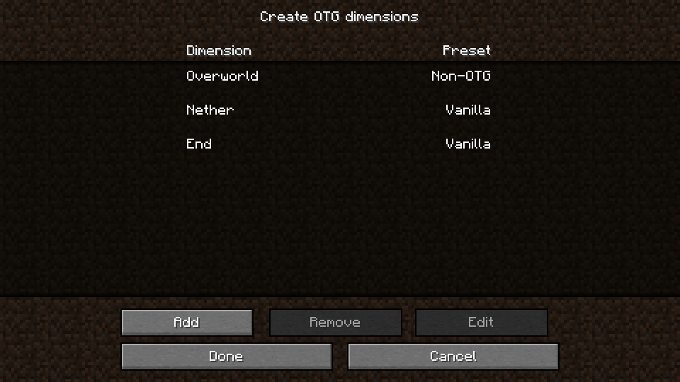 Clicking one of the normal Minecraft dimensions will allow you to choose from your list of installed presets which can be used for that world. Note that you do not need to use an OTG preset for these, you can also choose "Non-OTG" (which will present you with an option to choose a non-OTG world type) or "Vanilla" (which means OTG will not impact that dimension).