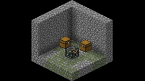 Dungeons are small rooms made of cobblestone and mossy cobblestone and contain a mob spawner and up to 2 chests.